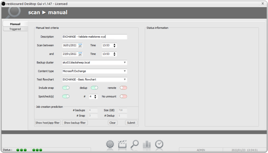 With restAssured backup data can be validated by creating test jobs. After having test flowcharts available for the backup content types you wish to validate test jobs can be deployed. There are several ways to create a test job to create optimal usability for the operations organization. By using the manual (on-demand) option, a created test job can be submitted as a AD hoc validation test. Such a test job can still validate multiple backups depending on the job configuration settings, but will only be performed once.