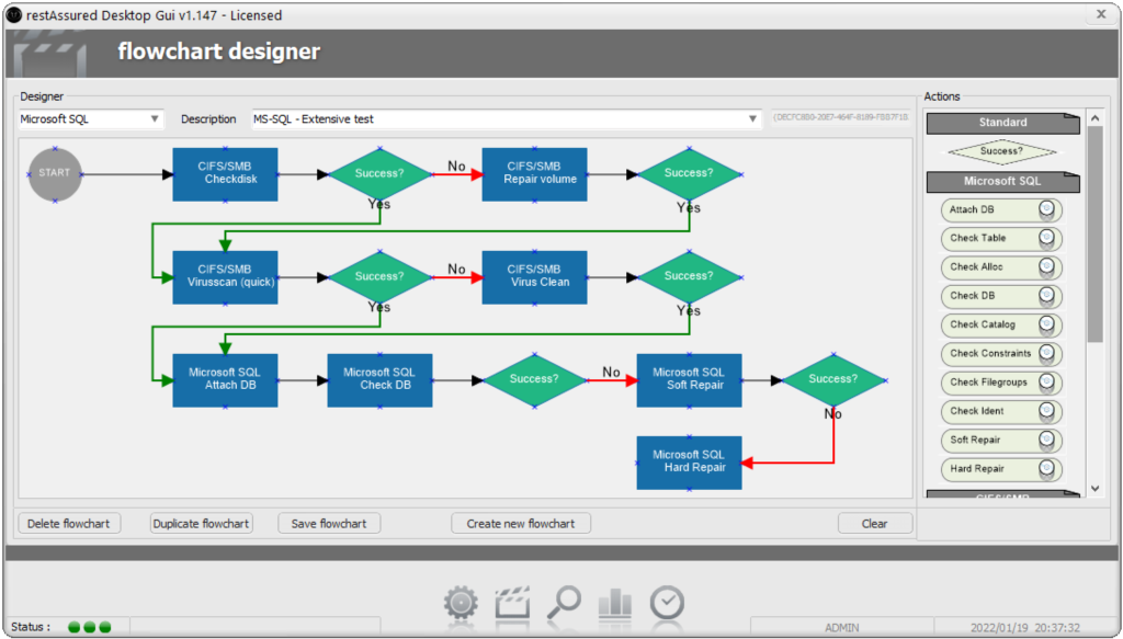 With the flowchart designer, one can create test flowcharts per content type, entirely according the business needs. The flowchart designer is simple and straightforward and requires no specific flowcharting knowledge. You complete freedom in the design of the tests. Flowcharts can be created from simple linear, to complex decision-based tests, depending on the goal that has to be achieved. It is possible to create multiple flowcharts per content type. This allows you to perform tailor-made testing for specific data sets. In addition to the ability to test data integrity, there are also several options to attempt to repair data after found problems. This will show immediately if a backup, even if it has data integrity issues, can still be used to restore production functionalities! restAssured includes support for various content types such as: Microsoft SQL, Microsoft Sharepoint, Microsoft Exchange, mySQL, PostgreSQL, MariaDB, MongoDB and Oracle. SMB (CIFS) or NFS file-share backups can also be tested, including virus-scanning and, or cleaning.